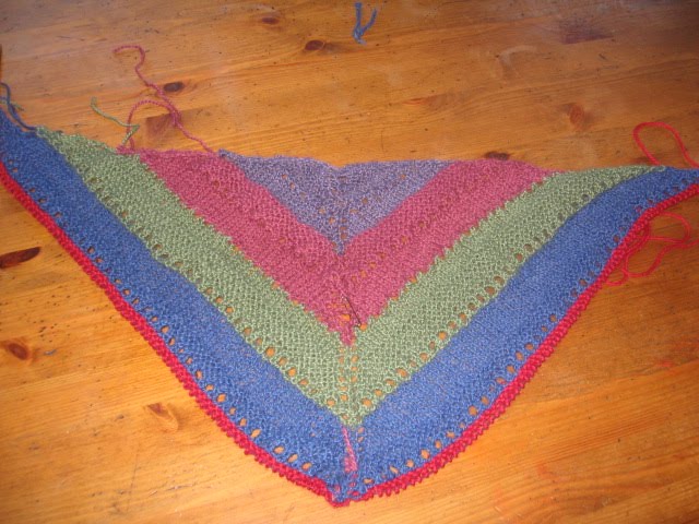Here are a couple of piccys, its about 30″ across the top at the moment, so there is alot of work to be done, i think the stripes make it easier to knit because i’m not getting bored of one colour.